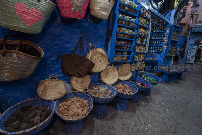 深蓝色墙边整齐摆放着各式草编篮筐和当地特产,从坚果到小饰品应有尽有,展现了传统手工艺与市集文化的完美融合。