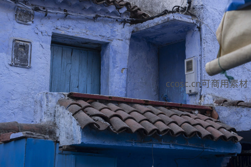 蓝墙斑驳老屋的红瓦窗台
