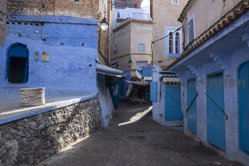 阳光穿过舍夫沙万狭窄的巷道,在蓝色的墙壁和石阶上投下温暖的光影。两侧是典型的北非风格建筑,静谧而富有诗意,是游客探索的理想之地。