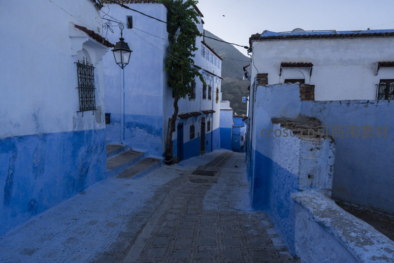晨光微露,蓝白相间的房屋在薄雾中若隐若现,老式街灯静静伫立,远处山峦隐约可见,整个街区弥漫着宁静诗意。