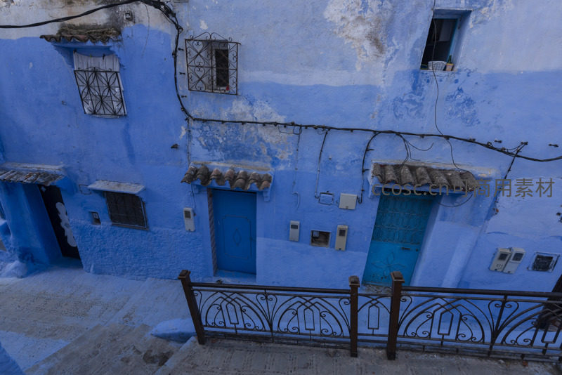 从高处俯瞰,蓝色墙体与锈迹斑斑的铁艺栏杆形成对比,电线交错,窗台陈设,真实呈现当地居民的日常场景。