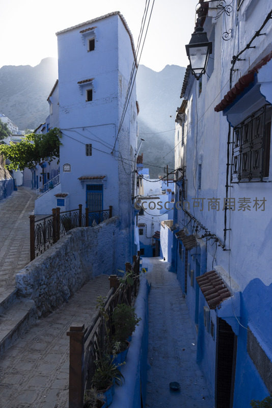 晨曦初照,蓝色房屋依山而建,石阶蜿蜒通向远方,木质栏杆与杂乱电线形成对比,整个小镇沉浸在宁静祥和的氛围中。
