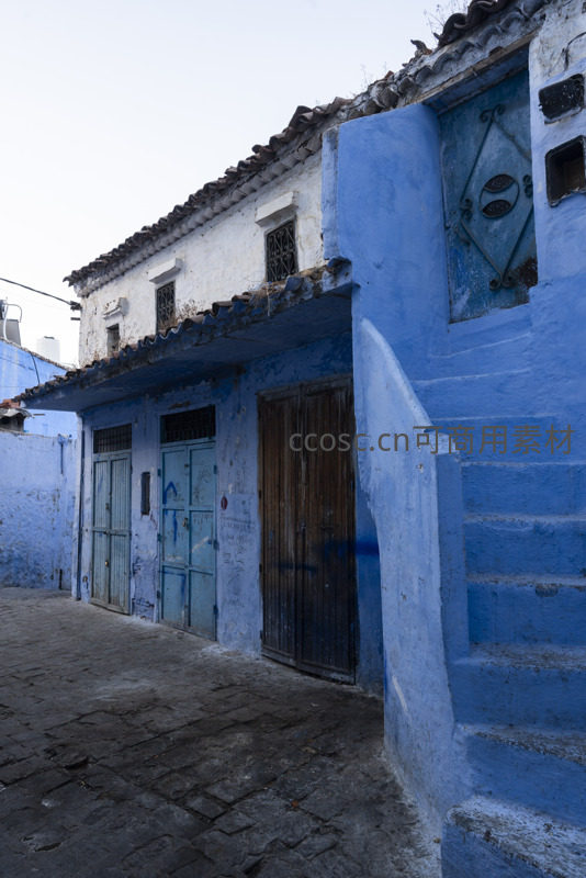 一栋被蓝色涂料覆盖的老宅静静伫立,木门斑驳、墙皮脱落,瓦片屋顶与石阶诉说着过往,角落里尽是生活留下的真实印记。