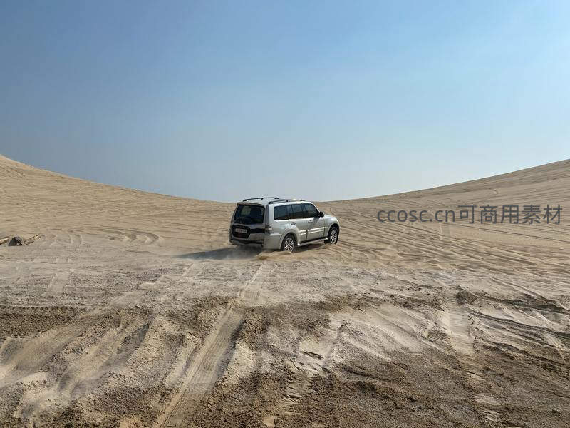 一辆银色越野车正奋力攀爬陡峭沙丘,车轮卷起漫天黄沙,展现出人与机器挑战自然极限的勇气与力量,背景是无垠蓝天。