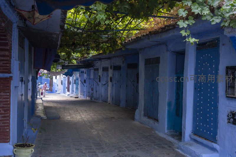 阳光透过茂密的葡萄藤洒在铺满石板的蓝色街道上,两侧房屋静谧安详,展现摩洛哥小镇的独特魅力。