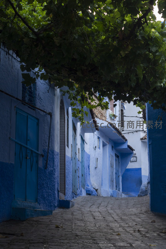 浓密的树叶遮蔽了部分天空,斑驳光影洒落在蓝色墙壁和石阶上,营造出清凉而神秘的巷弄氛围。