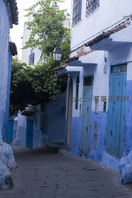 狭窄的石板路蜿蜒向前,两旁是刷着蓝色涂料的老屋,木质门扉与铁艺窗棂诉说着岁月故事。头顶绿树成荫,一盏复古路灯静静伫立,仿佛带人穿越时空。