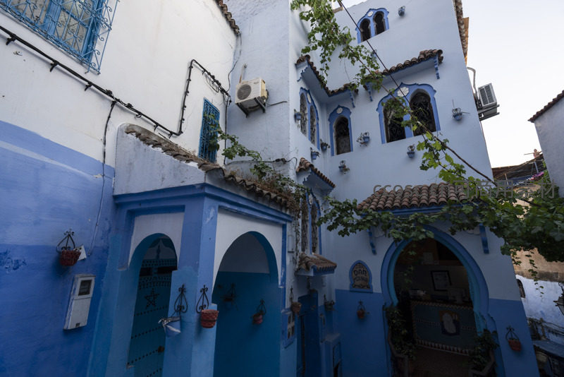 蓝白相间的拱廊下悬挂着小盆栽,墙面爬满绿藤,现代设施与传统建筑融合,体现充满生机与人文温度的街巷日常。