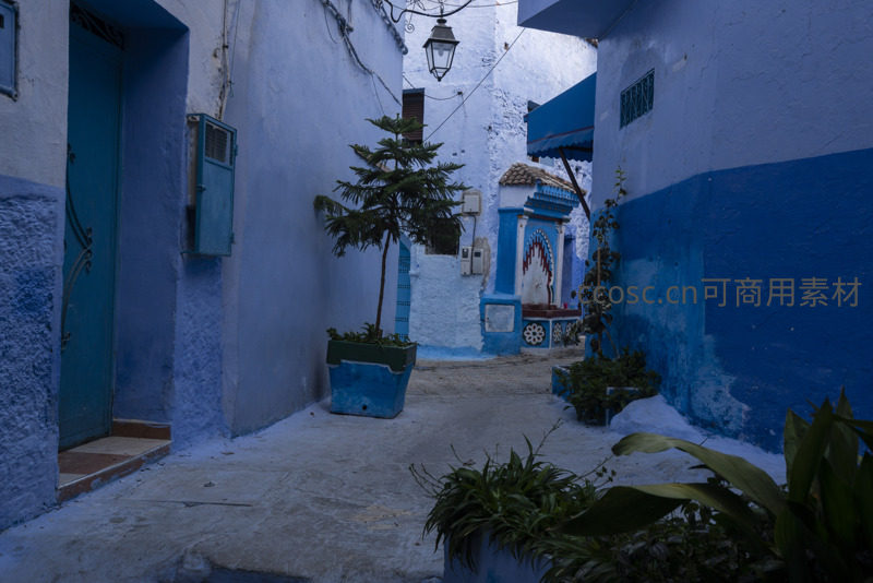 在一片蓝色的包围中,几株绿色植物从花盆和墙角探出,为冷色调的街道注入生命力,展现了人与自然在古老街巷中的和谐共存。