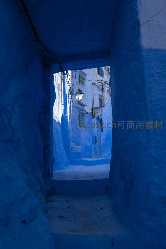 深邃的蓝色巷道如迷宫般蜿蜒,斑驳墙面与石阶诉说着岁月故事,一盏古灯点亮了静谧时光,是摩洛哥舍夫沙万独有的梦幻色彩。