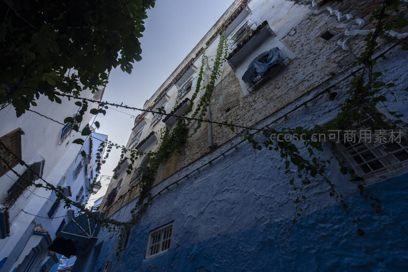 藤蔓攀爬的蓝白墙面仰视视角
