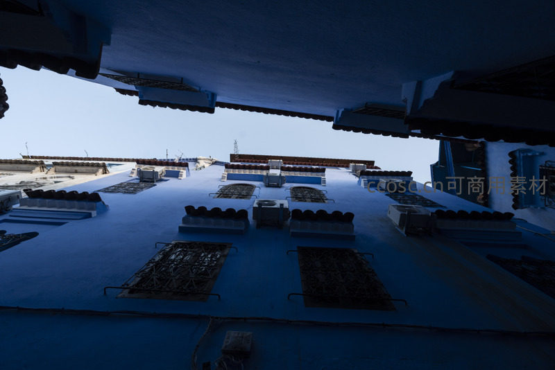 从屋檐下仰视,一片广阔的蓝色屋顶上整齐排列着多个空调外机和带铁栅栏的窗户,在晴朗天空的映衬下,展现出传统建筑与现代生活的融合。