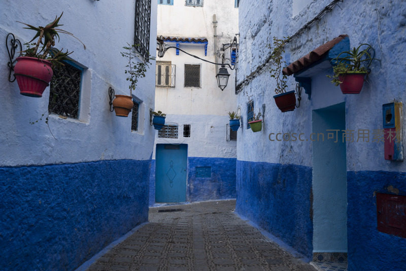 花盆点缀的蓝色弯巷