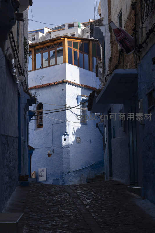 阳光洒在蓝白相间的墙壁上,蜿蜒的石阶小巷通向远方,传统木窗与铁艺门扉点缀其间,展现北非古城的独特韵味。