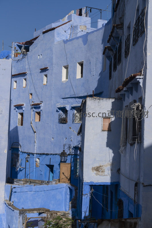 强烈的日光照射在错落有致的蓝色建筑上,明暗对比鲜明,窗户和电线交织出富有层次感的城市肌理。