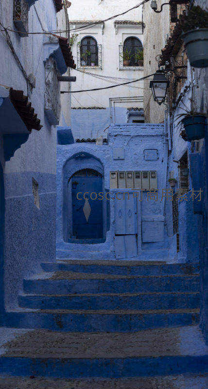 台阶引路至蓝门,窗台绿植添生机