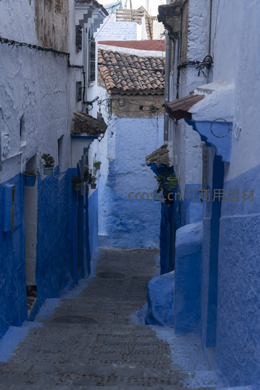 蓝白相间阶梯巷,绿植点缀古韵