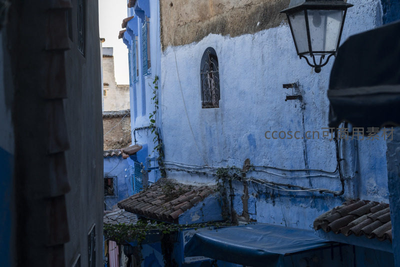 蓝色墙面老巷,铁艺窗灯诉时光