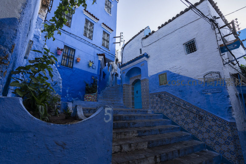 层层叠叠的蓝色台阶旁,点缀着五彩花盆与精美马赛克瓷砖,搭配白色墙面与绿植,营造出地中海式浪漫而富有生活气息的街景。