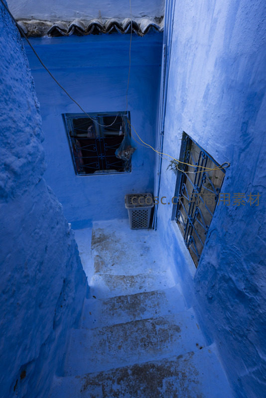 从高处俯瞰,蓝色的阶梯蜿蜒向下,窗台上随意摆放的生活物品,为这片宁静的蓝色空间增添了一抹人间烟火气,充满故事感。