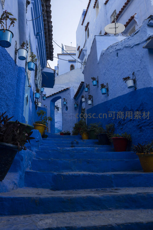舍夫沙万的蓝色阶梯两侧,悬挂与摆放的各色花盆为冷色调墙面注入生机,阳光洒落,光影交错间展现当地居民对美的日常追求与独特生活哲学。