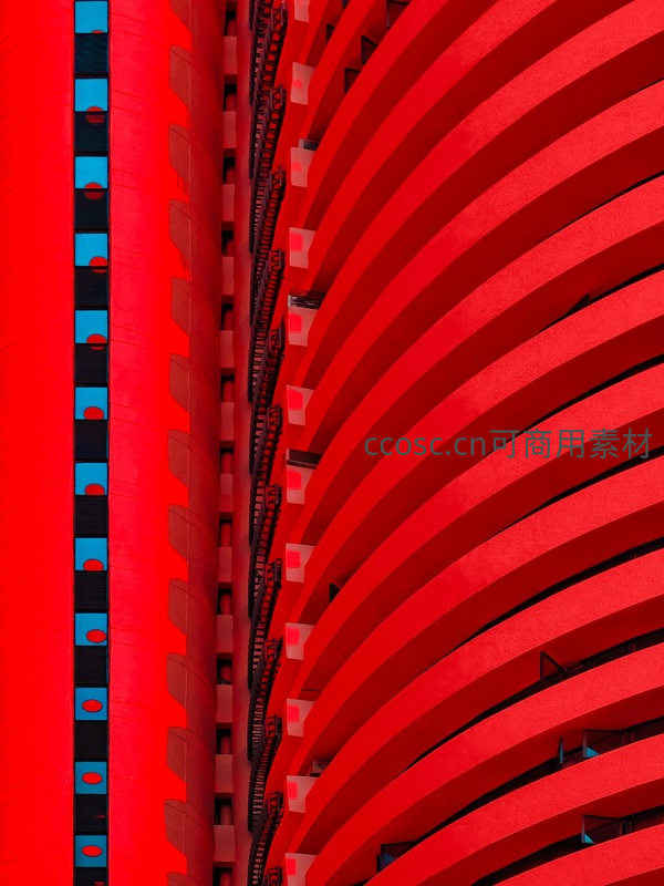 一座充满未来感的红色建筑,其层层叠叠的弧形结构在阳光下形成强烈的视觉冲击,展现了现代建筑设计的力量与美感。