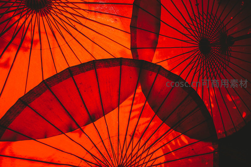 多把红色油纸伞交错叠放,其优美的弧线与放射状骨架构成一幅充满韵律感的画面,散发着浓郁的东方古典韵味。