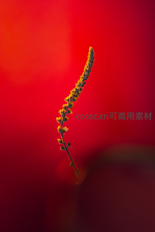 在纯红色背景的映衬下,一株纤细植物的花穗被捕捉成精致的剪影,突显其结构之美与生命力,充满艺术感。