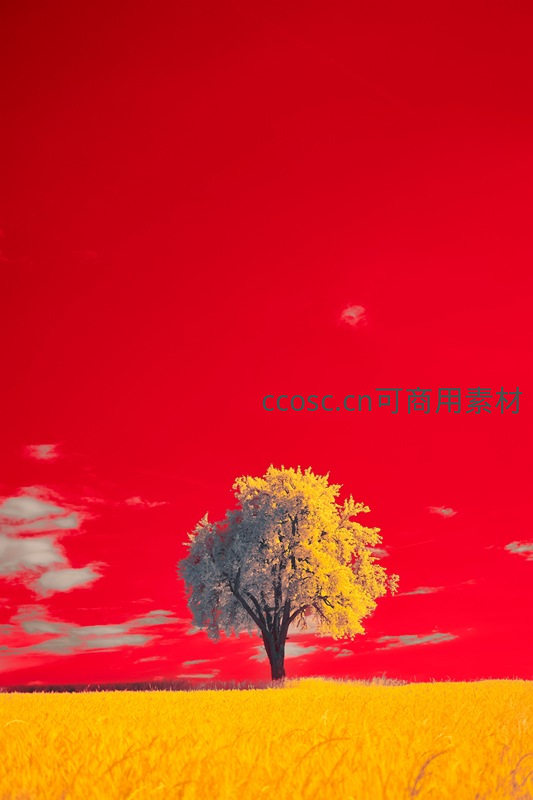一片超现实的景象,炽热的红色天空下,一棵孤独的树矗立在金黄的原野上,强烈的色彩对比营造出梦幻般的视觉冲击力。