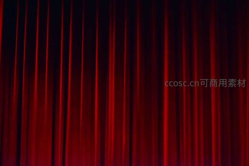 厚重的深红色天鹅绒幕布垂直悬挂,褶皱清晰可见,光线在布料上形成明暗对比,营造出一种庄重、神秘且充满期待的戏剧氛围。