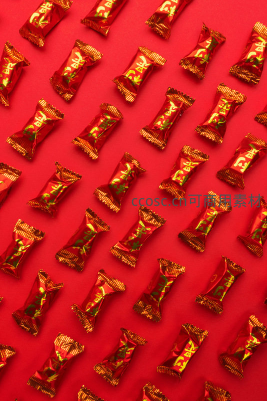 大量红色喜糖以规整的斜向阵列铺陈于同色背景之上,金箔烫字熠熠生辉,传递出婚礼的喜悦、甜蜜与浓烈的节日祝福氛围。