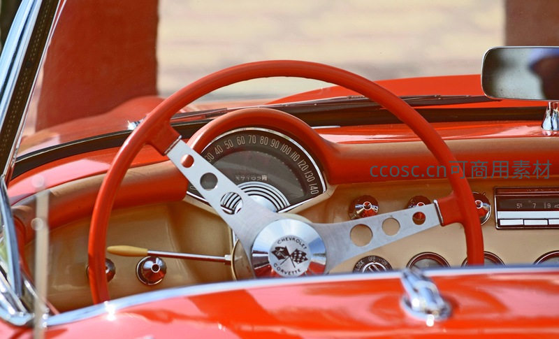 特写镜头捕捉了经典雪佛兰跑车的驾驶舱,橙色方向盘与米色仪表台相得益彰,金属质感的标志和指针细节彰显了其不凡的年代感与工艺。
