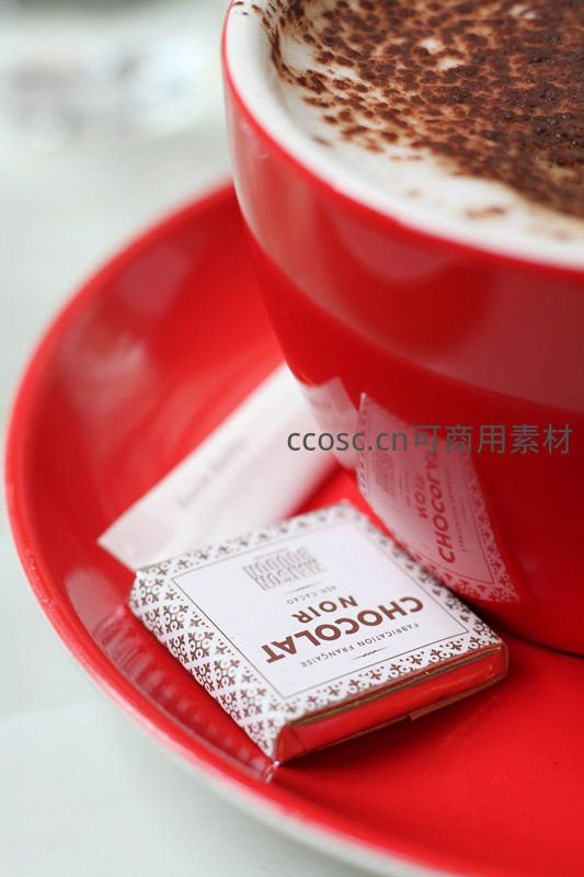 一杯撒满可可粉的红色马克杯热巧置于同色碟上,旁侧搭配一块包装精美的法国黑巧克力,营造出温暖惬意的午后享受时光。