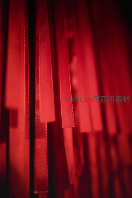多条红色丝带垂直悬挂,柔和光线穿过缝隙形成明暗交错的光影效果,展现材质的细腻纹理与优雅的动态美感。