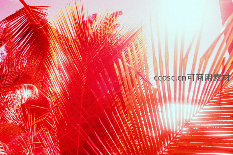 在强烈的日光照射下,棕榈叶呈现出鲜艳夺目的红色调,叶片脉络清晰可见,营造出一种热烈而梦幻的视觉效果。