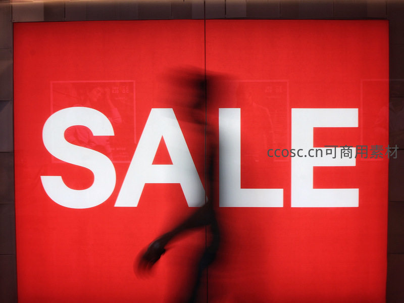 巨大的红色“SALE”促销海报前,一个行人的模糊身影快速走过,动静结合的画面捕捉了商业街的繁忙与消费主义的氛围。