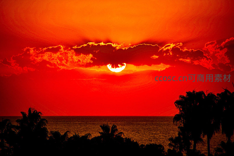 火红的夕阳被厚重云层半遮,将天空染成一片赤焰,海面波光粼粼,前景棕榈树剪影勾勒出热带海岸的宁静与壮美时刻。