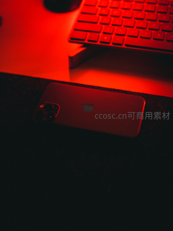 在浓郁的红色灯光映照下,一部智能手机与机械键盘静置于桌面上,营造出充满未来感与科技氛围的视觉效果。