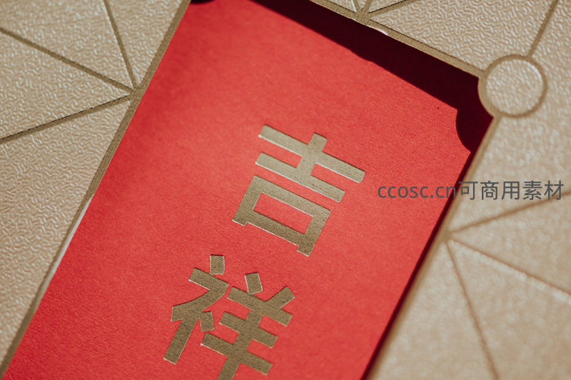 微距镜头下的红色红包,金色“吉祥”二字立体凸起,背景是精致的米色几何纹路,象征着新年祝福与好运,传递着浓厚的节日喜悦与文化内涵。