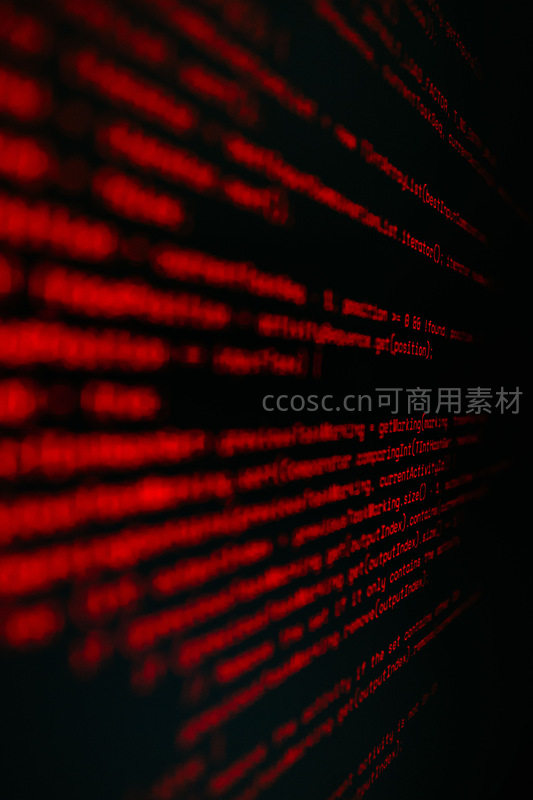 深邃的黑色背景上,鲜红的代码行如数据洪流般流动,营造出强烈的科技感与未来氛围,象征着数字世界的核心与力量。