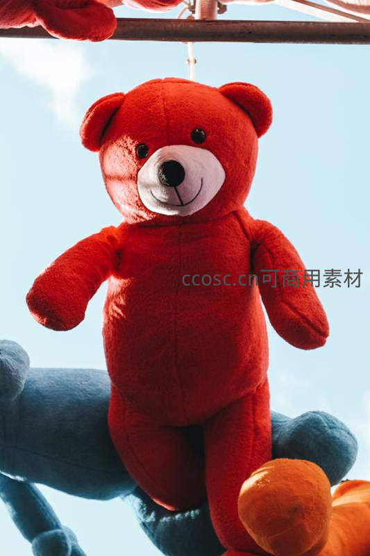 一只毛茸茸的红色泰迪熊面带微笑,被悬挂在晴朗的蓝天背景下,周围还有其他玩偶,充满了童趣与欢乐的氛围。