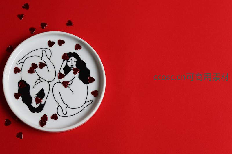 白色瓷盘上绘有简约线条的情侣图案,周围散落着闪亮的红色爱心,背景为纯正红色,营造出浓郁的浪漫氛围。