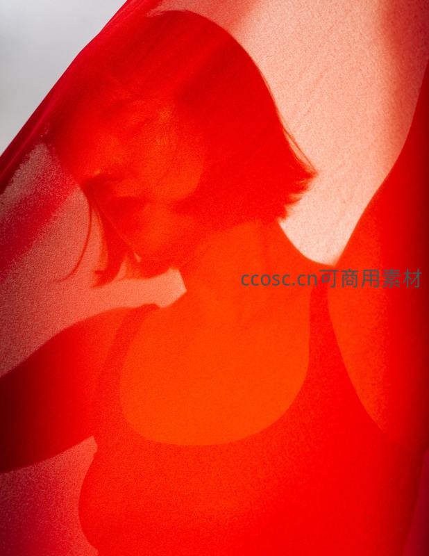 一位女性的侧脸与肩部轮廓透过一层鲜红色薄纱呈现,光影交错间流露出温柔、梦幻与艺术气息。