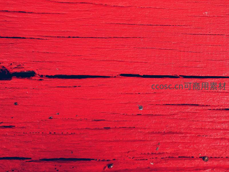 对一块涂有鲜红色油漆的木质表面进行近距离拍摄,清晰呈现木材天然的纹理、细微的裂痕和斑点,是极具视觉冲击力的抽象背景或装饰素材。