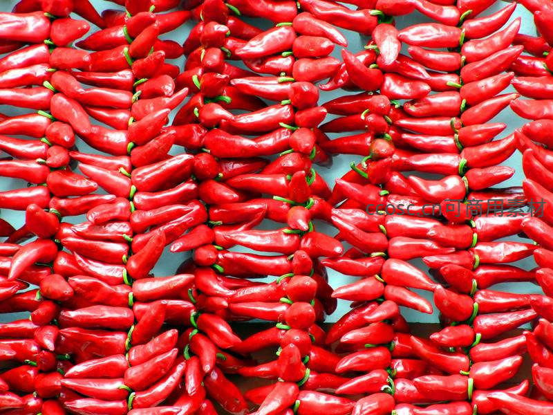 大量鲜红饱满的辣椒被整齐地串起并悬挂晾晒,形成一片热烈的红色海洋,展现了丰收季节的喜悦和传统农作的场景。
