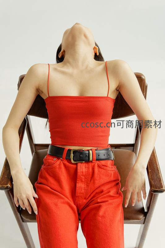 一位身穿红色吊带上衣和红色长裤的女性,后仰靠在木椅上,头部向后仰起,展现出一种放松与自信的姿态。