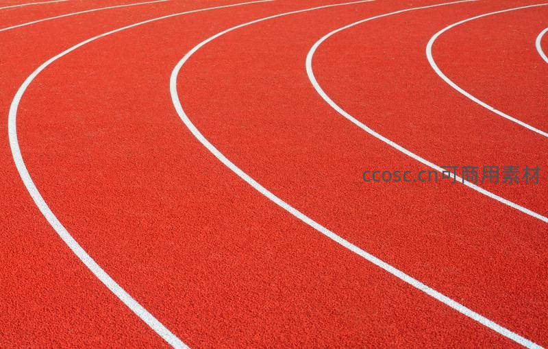 红色塑胶跑道的局部特写,白色分道线沿着流畅的曲线延伸,展现运动场地的动感与秩序感。