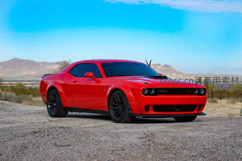 一辆鲜红的肌肉跑车停驻在广袤的沙漠砾石路上,背景是连绵起伏的远山与湛蓝天空,展现出力量与自然的完美融合。