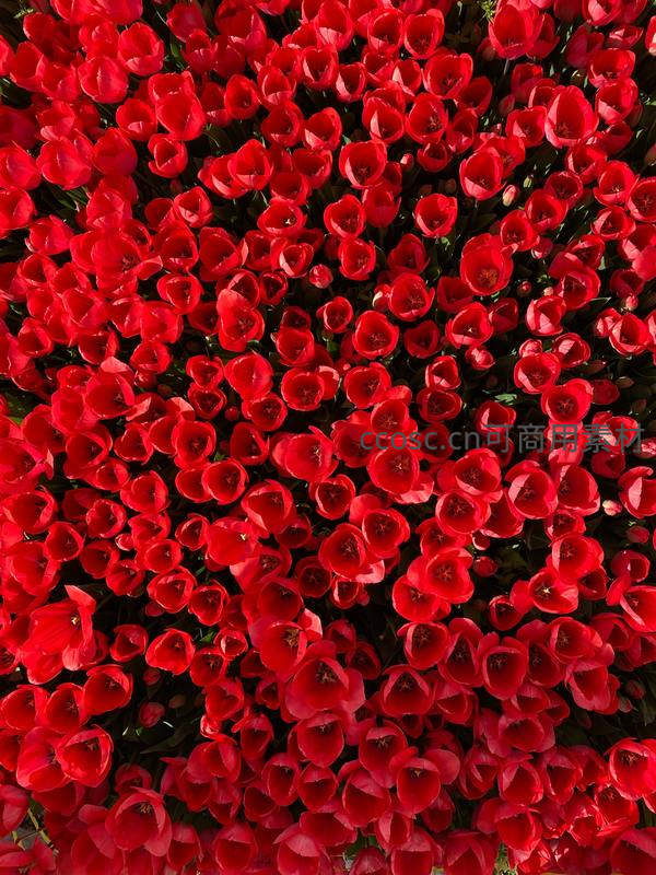 从高处俯瞰,无数朵饱满的红色郁金香紧密相连,形成一片无边无际的花海,鲜艳夺目的色彩洋溢着春天的生机与活力。
