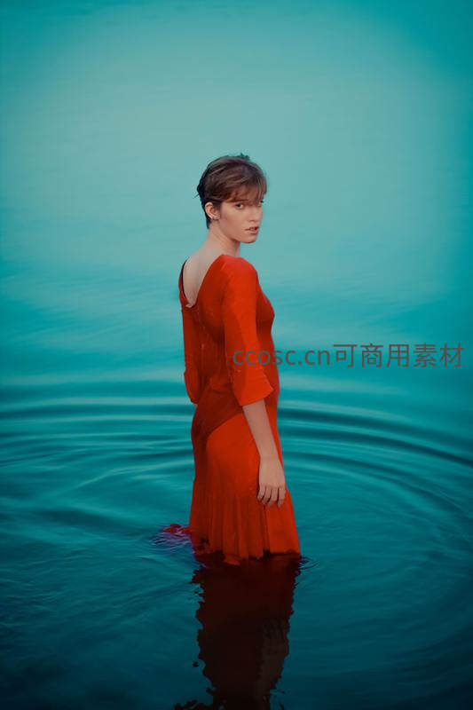 红裙女子伫立碧波水中回眸凝望